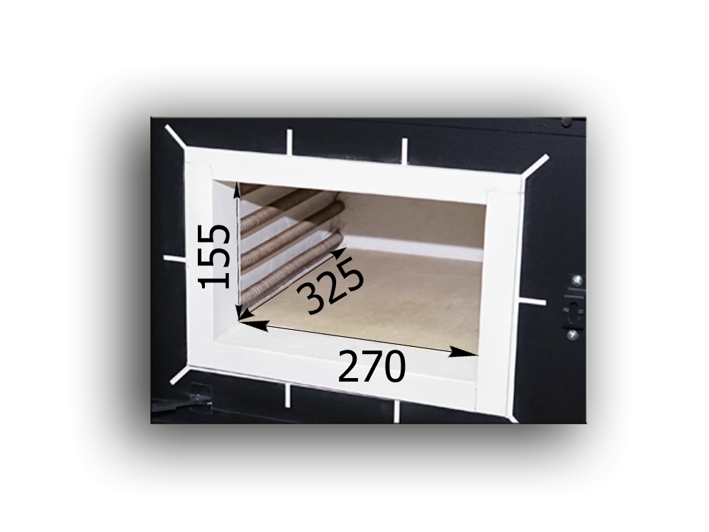 Нагрев камеры происходит с двух сторон, материал нагревателей фехраль. Установлен концевой выключатель, позволяющий обесточить рабочую камеру при открывании двери.